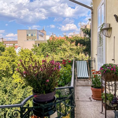 On the 160 sqm the aparment offers 3 good size bedrooms, one is currently in use as an office, or library, a spacious living room with open-plan kitchen and dining area, opening from the entry space, and two bathrooms, one with bathtub and the other with shower cabin. The windows facing the street and west have expandable shutters allowing the apartment to be ventilated even on the sunniest days with shade. Additionally to the flat space there is a separated balcony area towards the inner garden, with views over the neightboring buildings.